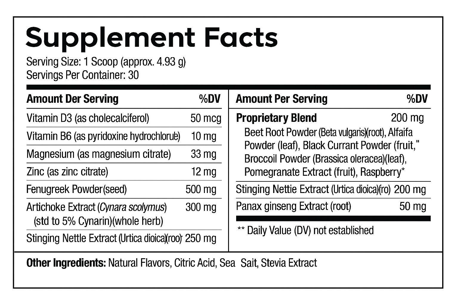 Fenugreek – Contains saponins that may support prostate function, male hormones, and libido.